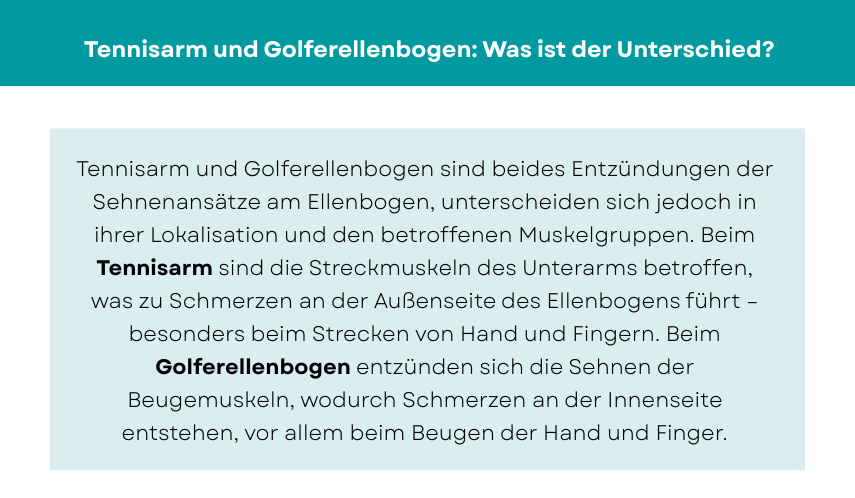 Treten die Beschwerden stattdessen an der Innenseite des Ellenbogens auf, handelt es sich meist um einen Golferellenbogen, der zwar ähnliche Symptome, aber eine andere Lokalisation und Ursache hat.